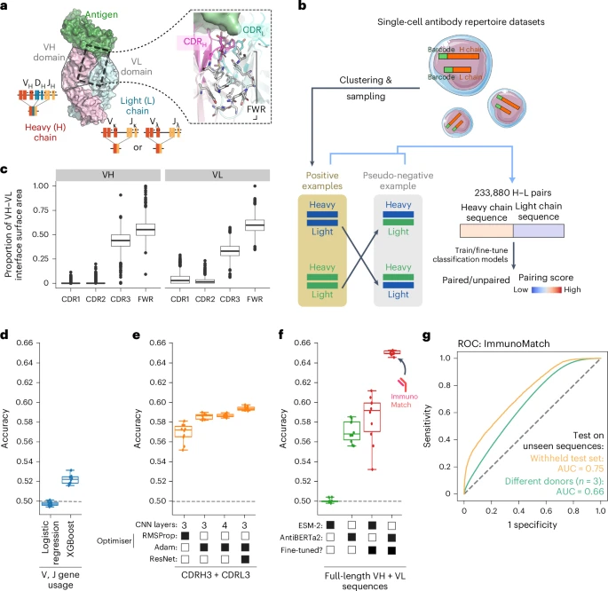 研究团队的任务就是训练这位AI博士,让它成为一名眼光毒辣的“月老”。他们把成千上万的“夫妻”照片(序列信息)喂给它,告诉它哪些是原配,哪些是乱配的。经过海量学习,这个AI——他们称之为ImmunoMatch——逐渐领悟到了重链与轻链之间那种微妙的、决定它们能否和谐共存的“化学反应”。
